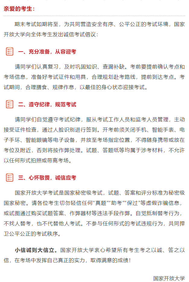 国家开放大学致全体考生的一封信