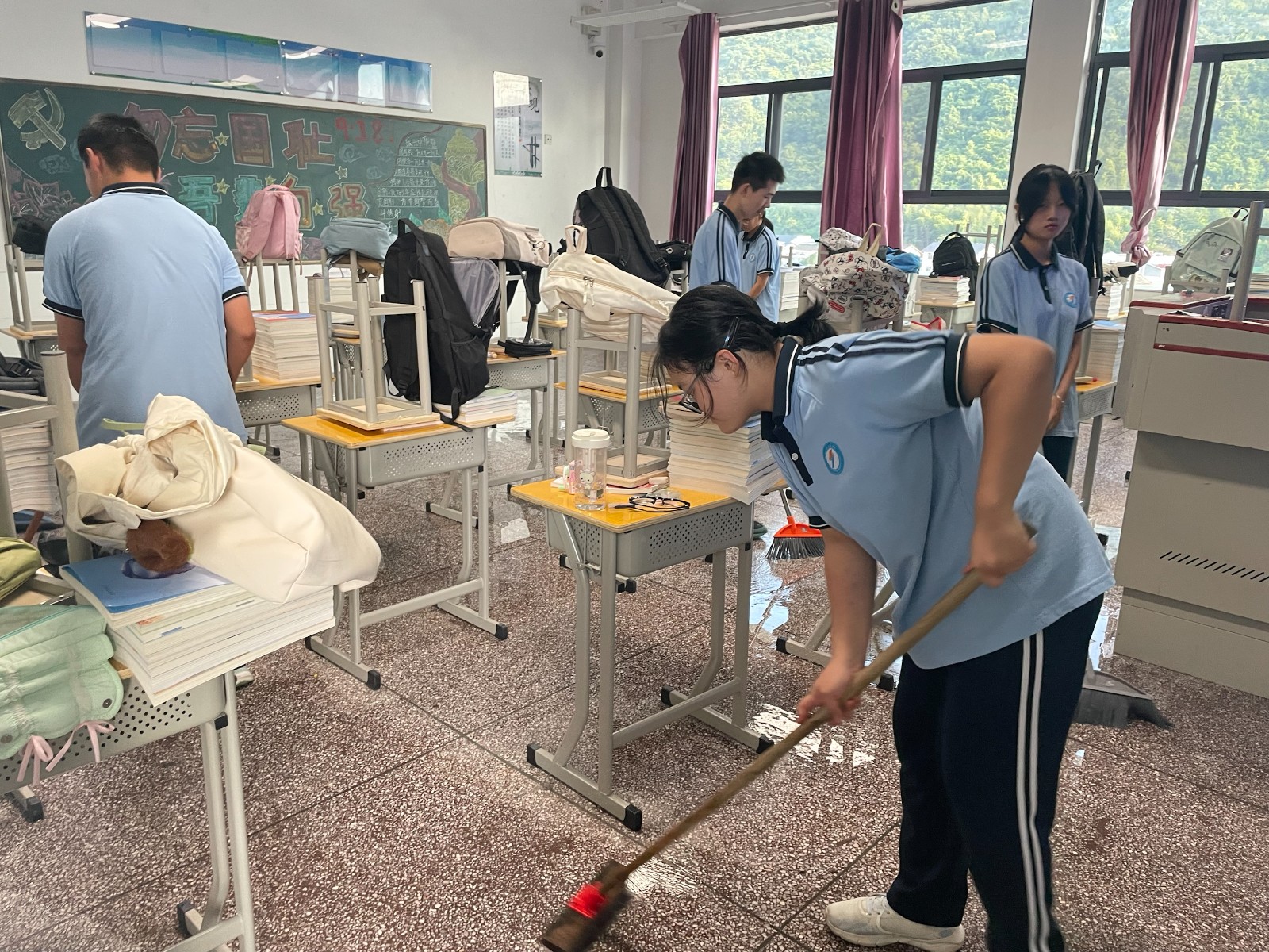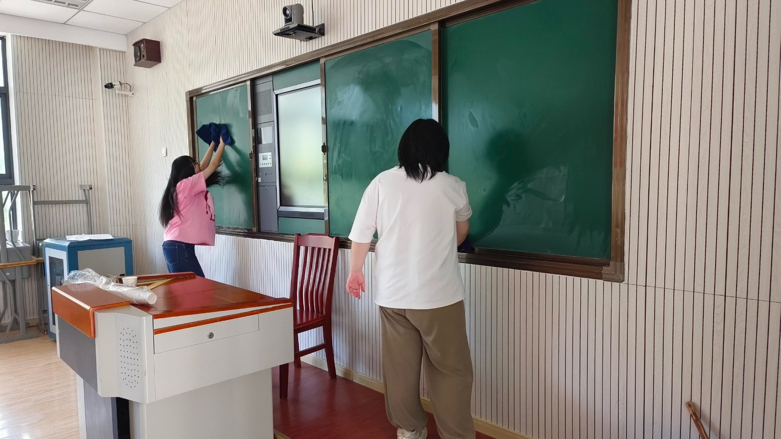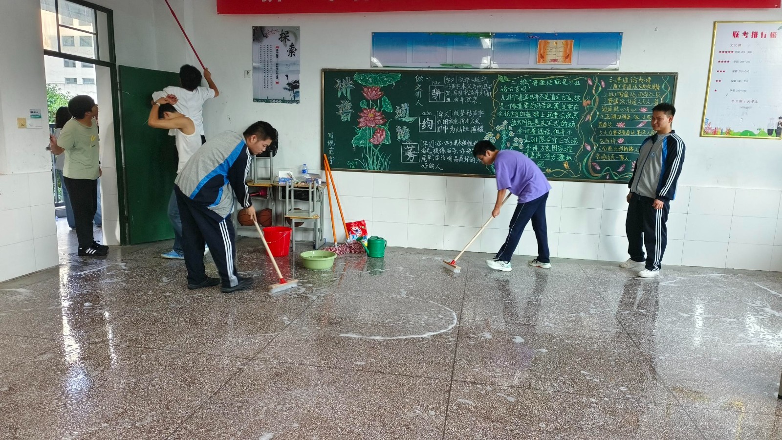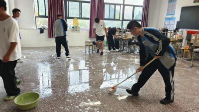 秋日暖阳透过刚刚擦亮的玻璃窗,洒在走廊里一群忙碌的学生身上。他们手持清洁工具,仔细地清扫着每一处角落,不放过任何一片纸屑、一个污点。在教室、走廊、寝室、公共区,学生们分工协作,有的整理讲台,有的擦拭桌椅,有的清理校园绿化带中的落叶杂物。